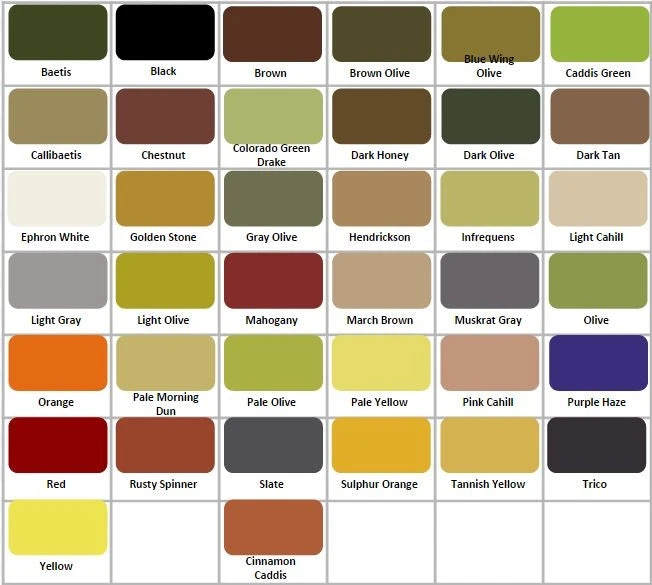 | Color | Black, Black Stonefly, Brown, Brown Olive, Canadian Brown, Claret, Cream, Dark Brown, Dark Olive, Fl. Blue, Fl. Chartreuse, Fl. Cherry Red, Fl. Green, Fl. Hot Pink, Fl. Orange, Fl. Pink, Fl. Purple, Fl. Yellow, Ginger, Golden Olive, Golden Stone, Gray Olive, Light Gray, Mahogany, Medium Olive, Mottled Caddis Green, Muskrat Gray, Natural White, Olive, Orange, Pale Yellow, Peacock Green, Red, Royal Blue, Rusty Brown, Tan, Yellow |
