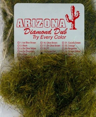 | Az Diamond Dub Colors | Blood Leech, Bronze Peacock, Caddis Green, Callibaetis, Copper Olive, Dark Olive Yellow, Golden Olive Brown, Golden Yellow, Ice Blue Brown, Lt. Cream, Lt. Olive, Midnight Fire, October Caddis, Peacock, Tan, Olive Brown, Black Blue, Black Red, Copper Mocha, Dark Copper Mocha, Olive Mocha, Pheasant Tail Brown, Purple, Red, Black, Chartreuse, Chocolate, Crystal, Dark Chocolate, Dark Hare's Ear, Dark Oak, Dark Olive, Dark Olive Brown, Hare's Ear, Hot Pink, Lt. Tan, Oak, Olive, Orange, Pink, Tangerine, Violet, Yellow |